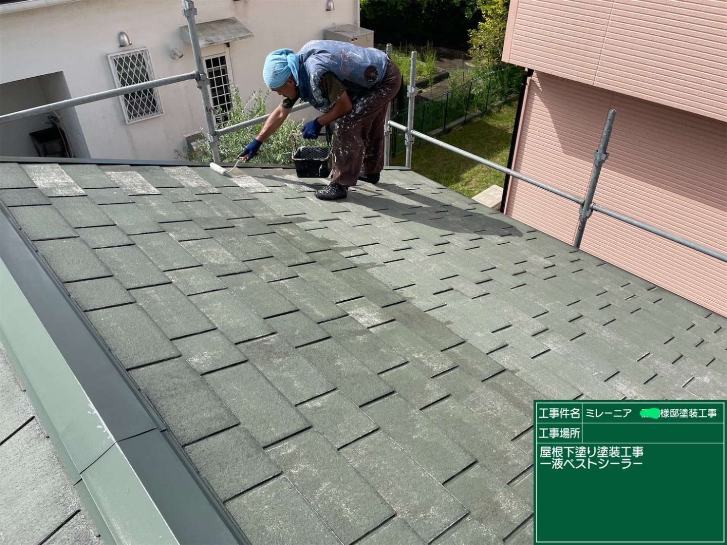いすみ市岬町T様邸 屋根下塗り中です。 上塗りの色はグリーンに決まりました💚💚💚 施工完...