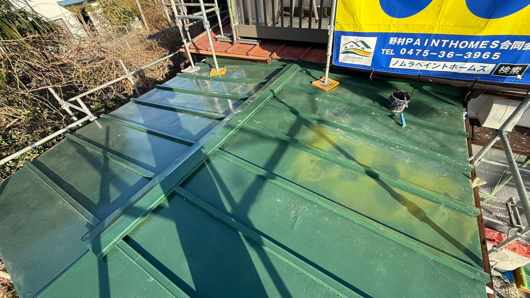 いすみ市岬町T様邸 屋根下塗り中です。 上塗りの色はグリーンに決まりました💚💚💚 施工完...