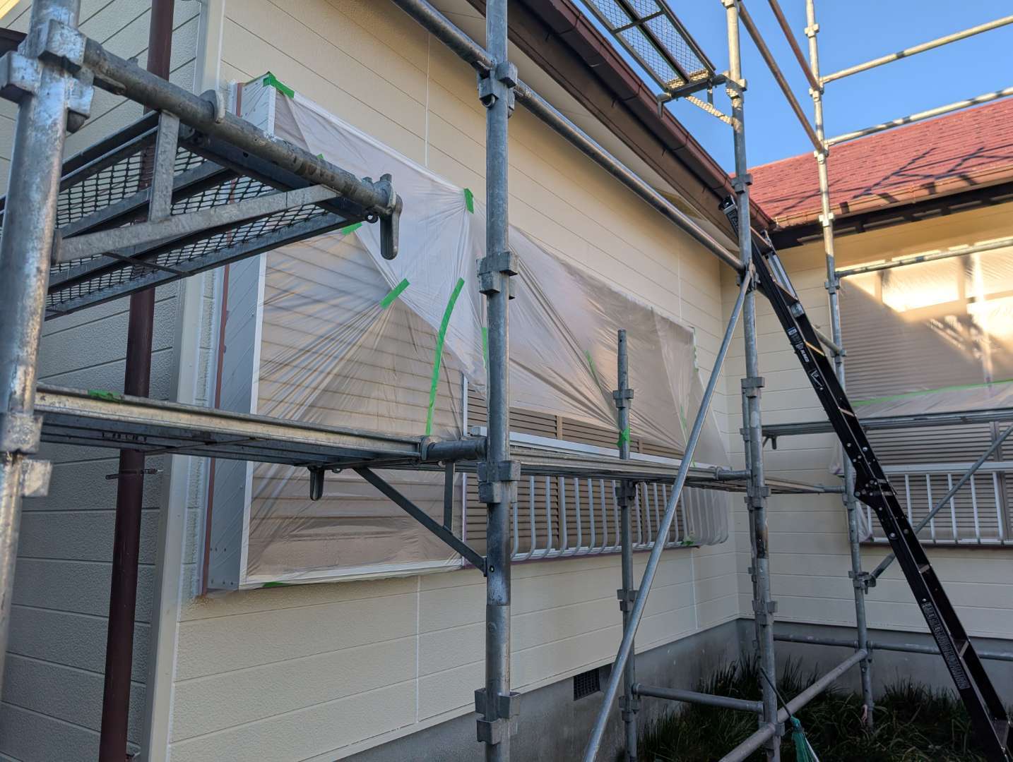 塗らない箇所(サッシ、窓ガラス、床、植栽など)は、塗料が飛散する可能性がある範囲を考慮し、隙間なく覆い尽くすことが基本です。特に風の影響や、高圧洗浄後の水切りなども考慮に入れる必要があります。