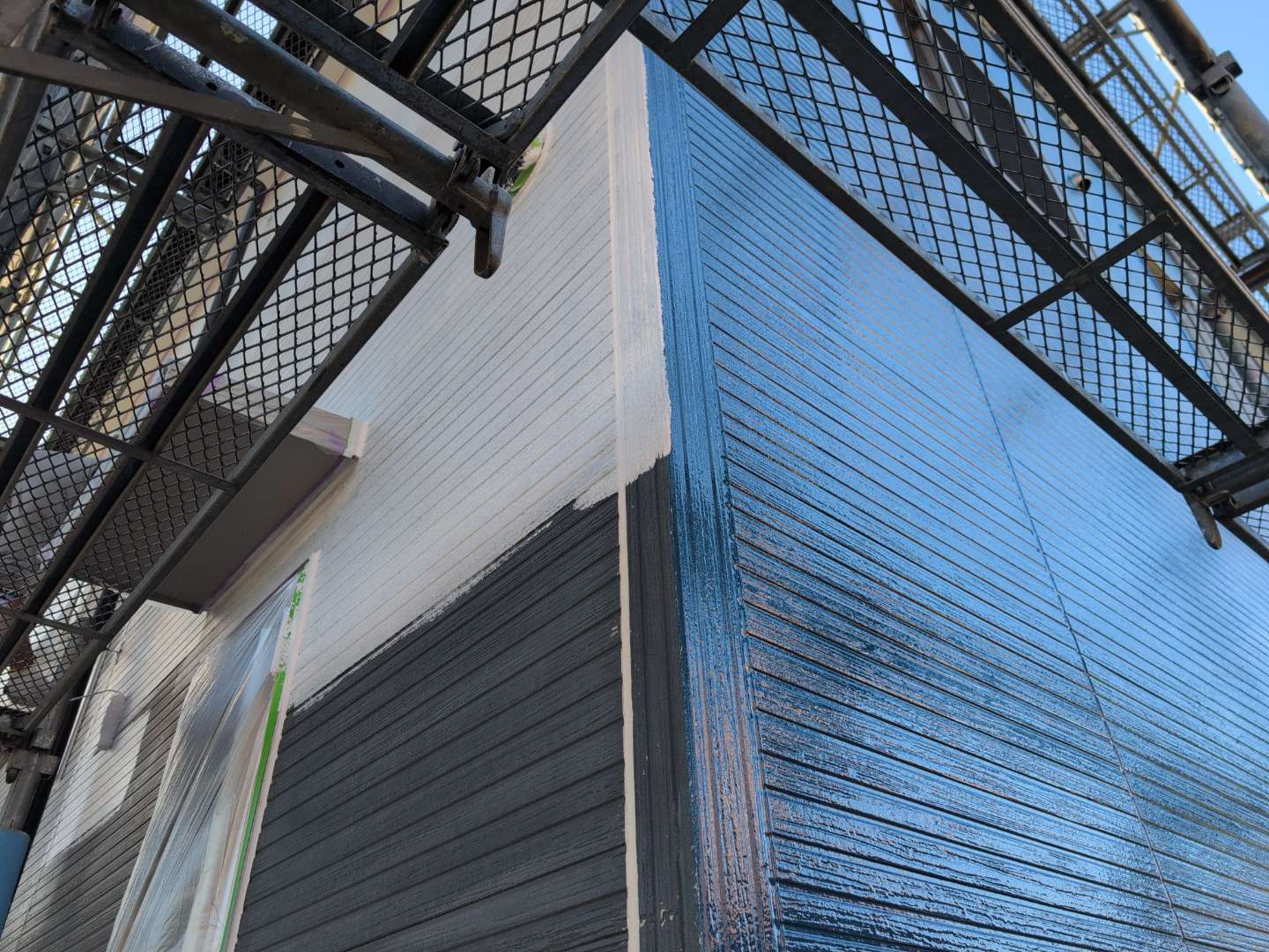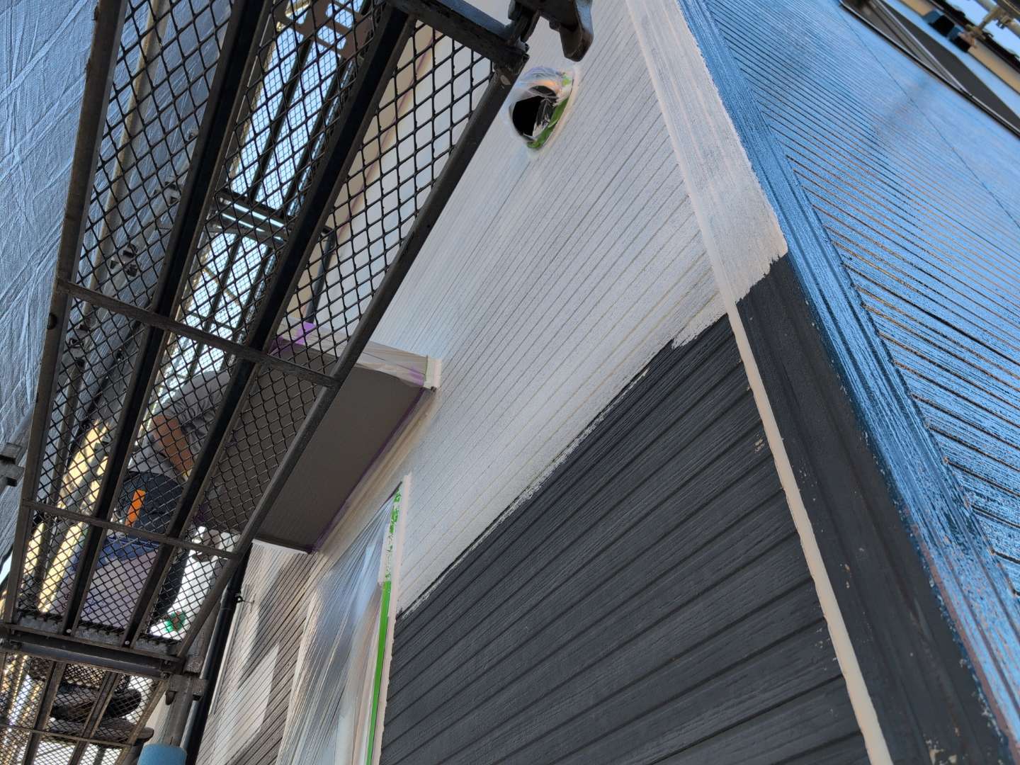 下塗り後、白いサイディングを張り替えたベランダ面も塗装をおこないます😉✨