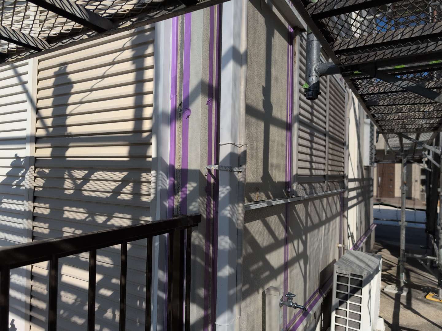 窓やサッシ: 塗料が飛散して付着しないように、専用のビニールシートで覆います。特に高圧洗浄時にも水が飛び散らないよう、隙間なく丁寧に行います。