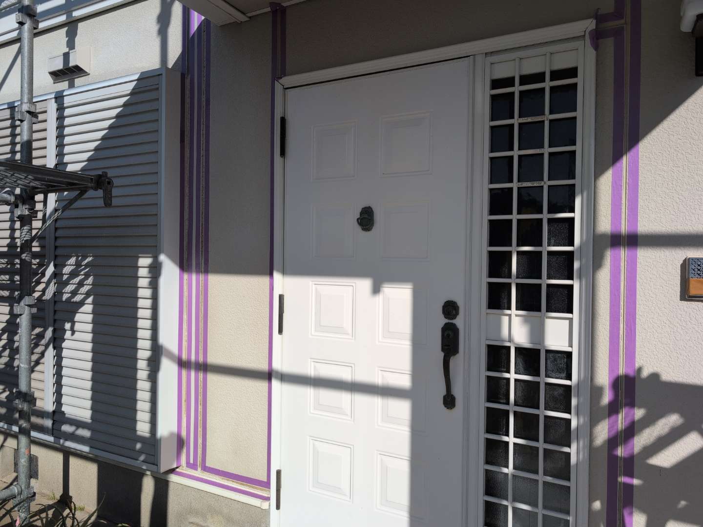 マスキングテープのライン: 窓枠、ドア枠、樋など、塗装する部分としない部分の「境目」に貼るマスキングテープは、定規で引いたようにまっすぐ、一直線に貼ることにこだわります。このラインが、そのまま仕上がりの美しさとなります。