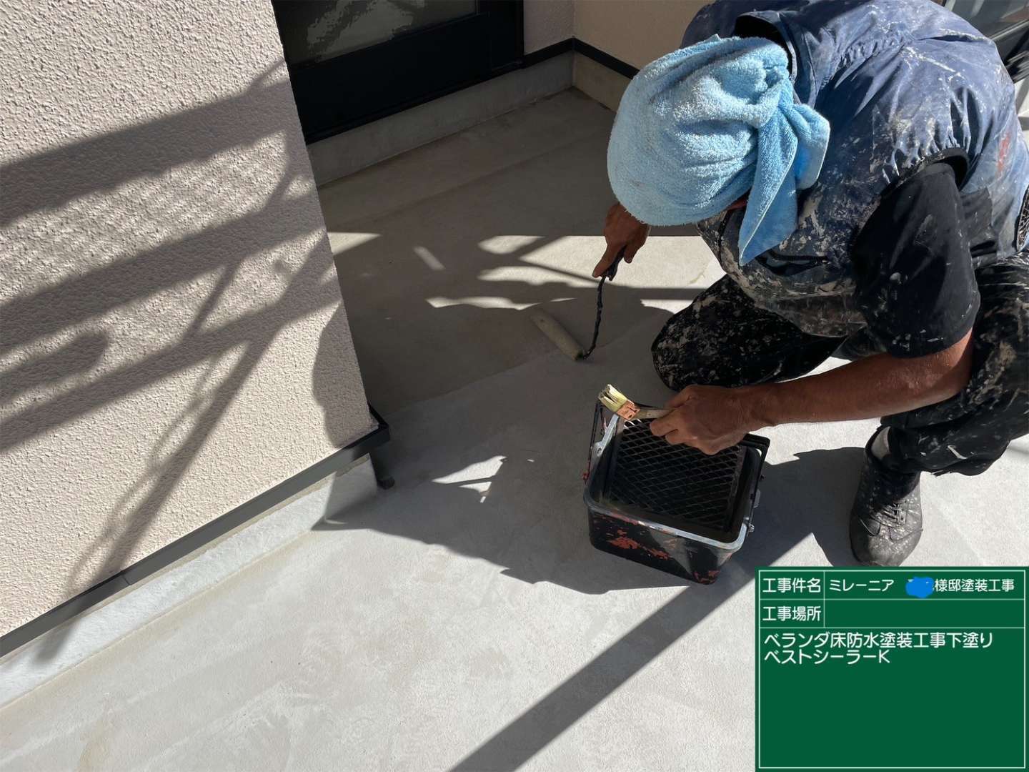 ベランダ床防水塗装中塗りが終わりました。 メーカー:アトミクス株式会社 塗料:アトレーヌ水...