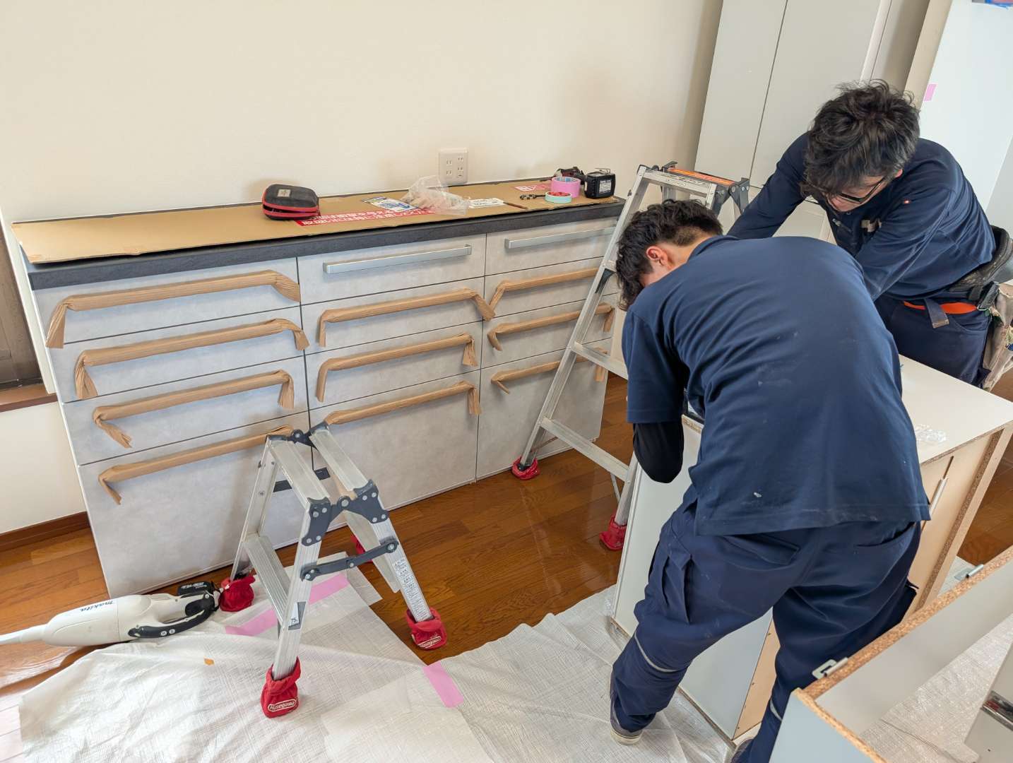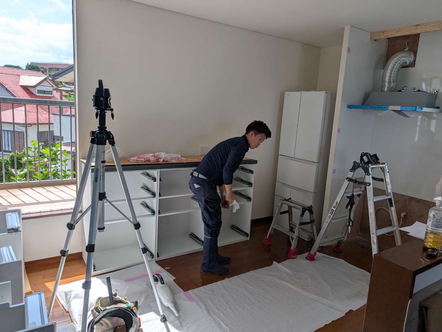 二階キッチンのため、ベランダから機材を搬入しての工事スタートです!