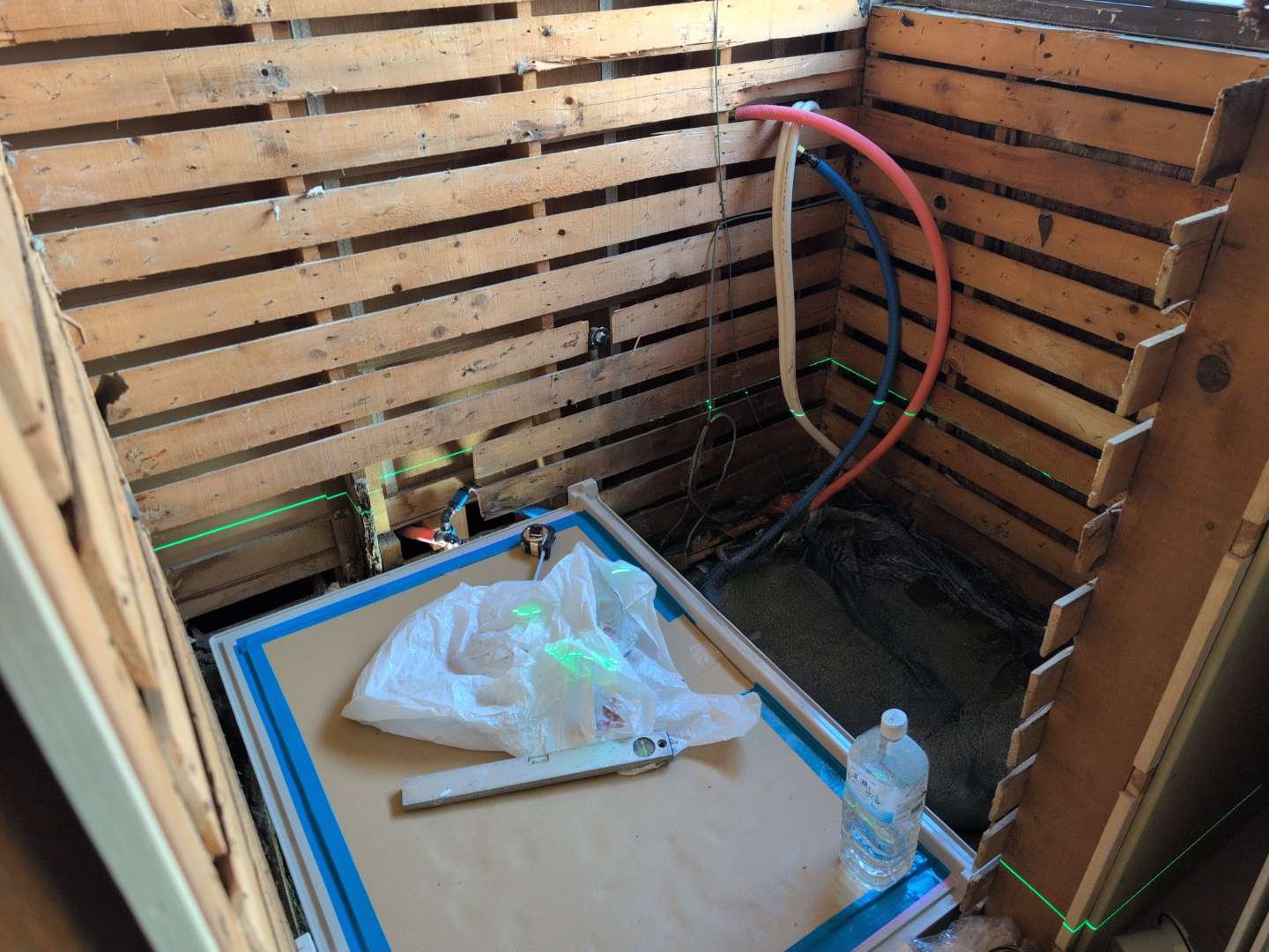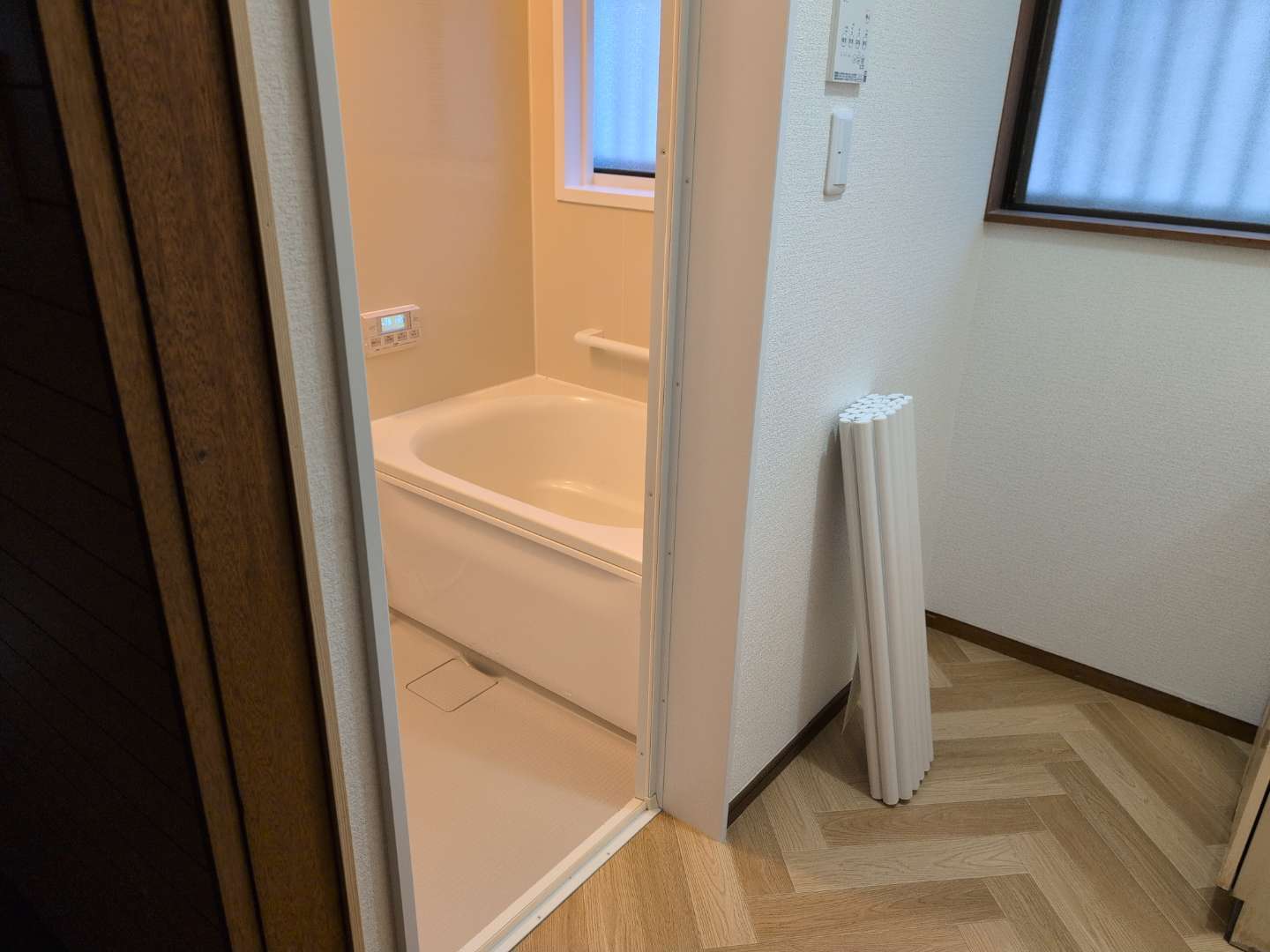浴室の扉を設置します。壁は新しいクロスをはるために、ボード材で平らにしました。