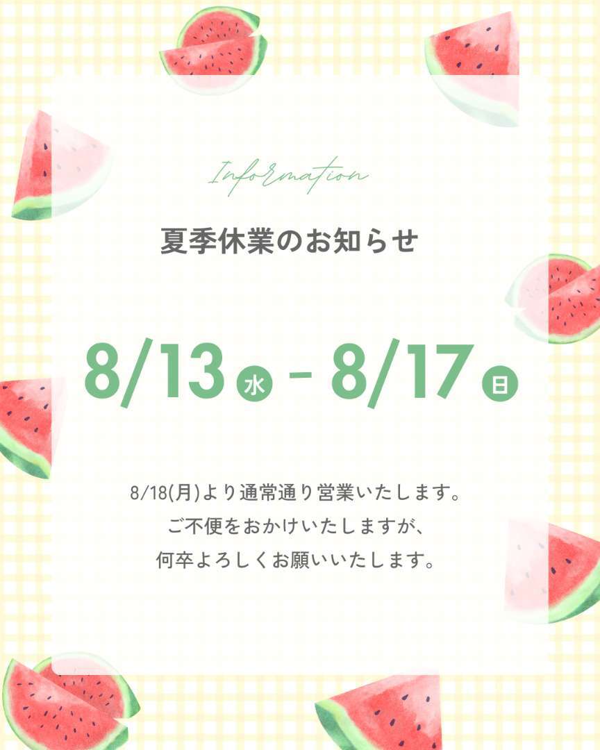 お盆休み期間:8月13日(水)~8月17日(日)