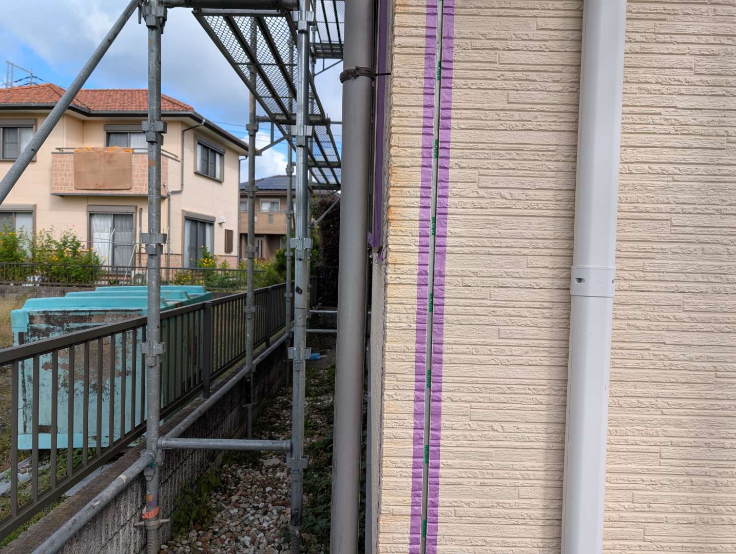目地の周りの外壁部分に、コーキング材が付着しないようマスキングテープを貼ります。 仕上がりを美しくし、外壁を汚さないようにするためです。